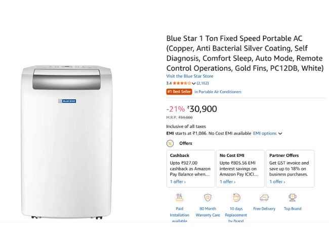அமேசானில் Blue Star 1 Ton Fixed Speed Portable AC இதன் விலை ₹30,900, அதன் MRP ₹39,900 உடன் ஒப்பிடும்போது. இதன் மூலம் ரூ9,000 வரை சேமிக்கலாம். உங்கள் பணப்பையை அதிகமாகச் சுமக்காமல் பார்த்துக் கொள்ள EMI திட்டங்களும் உள்ளன. இதை தவிர நீங்கள் Amazon pay மூலம் வாங்கினால் கேஷ்பேக் நன்மை பெறலாம் அதாவது இந்த Portable AC யில் ஆக மொத்தம் ரூ,9000 டிஸ்கவுண்ட் உடன் 29,973ரூபாயில் வாங்கலாம். மேலும் பல ஆபருடன் வாங்க இங்கே க்ளிக் செய்யுங்க