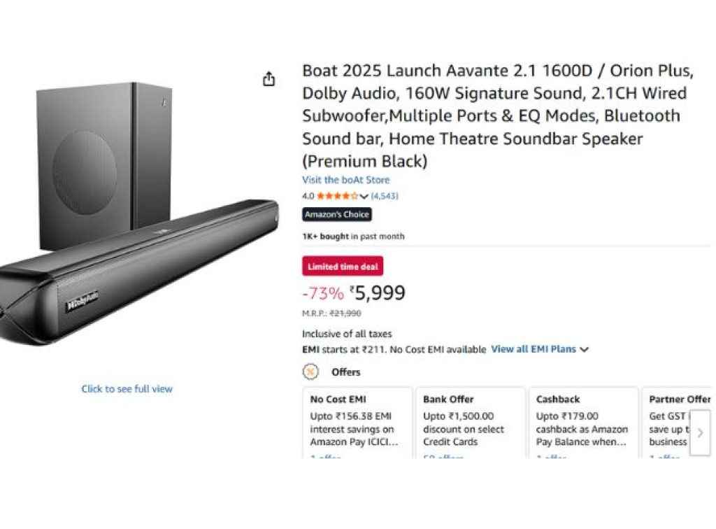 Boat 2025 soundbar அமேசானில் ரூ5,999க்கு லிஸ்ட்டிங் செய்யப்பட்டுள்ளது ஆனால் பேங்க் ஆபரின் கீழ் கிரெடிட் கார்ட் EMI ஆப்சனின் மூலம் ரூ,1000 டிஸ்கவுண்ட் வழங்கப்படுகிறது அதன் பிறகு இந்த சவுண்ட்பாரை வெறும் ரூ,4,999யில்வாங்கலாம் இதன் உண்மையான MRP விலையோ ரூ,21,990 ஆகும் அதிலிருந்து இப்பொழுது சுமார் ரூ,16,991 வரை டிஸ்கவுண்ட் நன்மை பெறலாம் இதை தவிர நோ கோஸ்ட் EMI மற்றும் எக்ஸ்சேஞ் போன்ற நன்மை பெறலாம்.