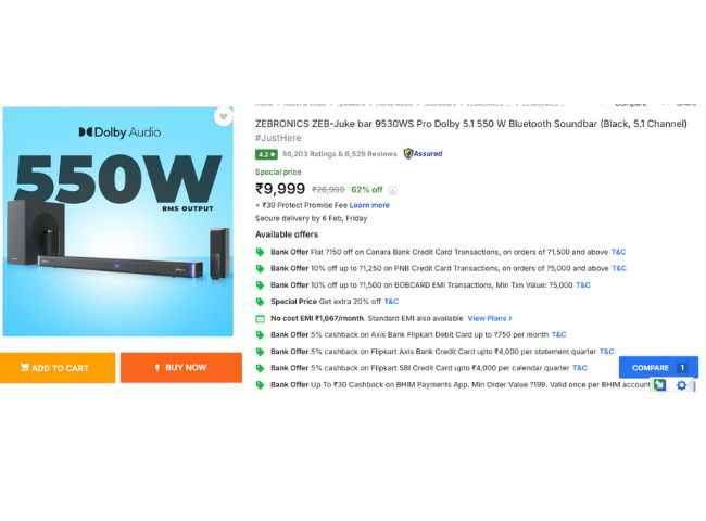 ZEBRONICS ZEB-Juke bar யின் விலை பிளிப்கார்டில் ரூ,9,999க்கு லிஸ்ட்டிங் செய்யப்பட்டுள்ளது ஆனால் பேங்க் ஆபரின் கீழ் வாங்கினால் ரூ,1,500 வரை இன்ஸ்டன்ட் டிஸ்கவுண்ட் வழங்கப்படுகிறது ரூ,8,499க்கு வாங்கலாம் இதை தவிர Axis மற்றும் SBI கிரெடிட் கார்டிலிருந்து வாங்கினால் கூடுதலாக ரூ,4000 வரை இன்ஸ்டன்ட் டிஸ்கவுண்ட் பெறலாம் இதை தவிர நோ கோஸ்ட் EMI போன்ற பல நன்மை பெறலாம் Zebronics யின் இந்த சவுண்ட்பாரின் MRP விலை ரூ,26,999க்கு லிஸ்ட்டிங் செய்யப்பட்டுள்ளது ஆனால் இப்பொழுது இந்த சவுண்ட்பாரில் ரூ,18,500 வரை அதிரடி டிஸ்கவுண்ட் பெறலாம்