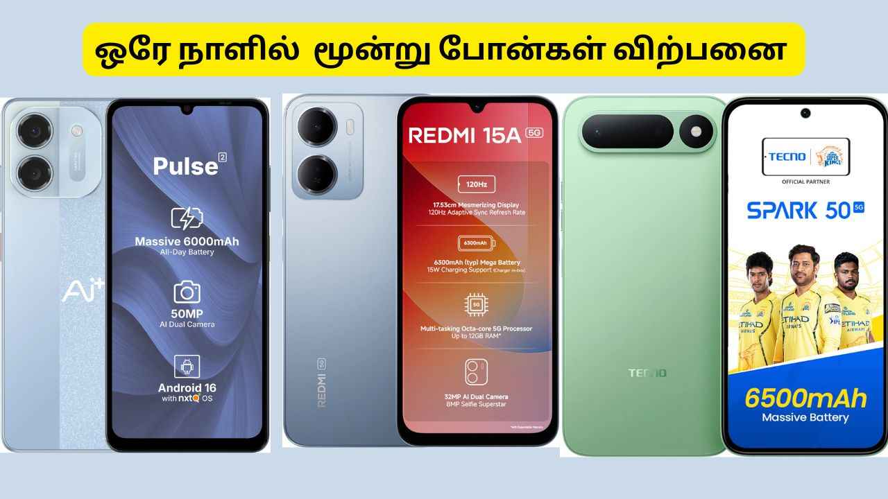இதில் Redmi 15A, Tecno Spark 50 5G மற்றும் Ai+ Pulse 2 ஆகியை போன்கள் விற்பனைக்கு வருகிறது