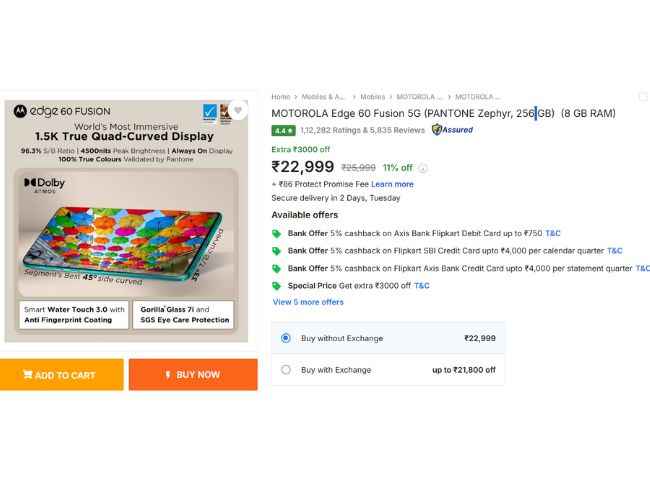 MOTOROLA Edge 60 Fusion 5G யின் 8 GB ரேம் மற்றும் 256 GB யின் மாடலின் விலை ப்ளிப்கார்டில் ரூ,22,999க்கு லிஸ்ட்டிங் செய்யப்பட்டுள்ளது ஆனால் இதில் ஸ்பெஷல் ஆபரின் கீழ் ரூ,3000 டிஸ்கவுண்ட் செய்யப்படுகிறது அதன் பிறகு இந்த போனை வெறும் ரூ,19,999க்கு வாங்கலாம் இதை தவிர Flipkart Axis Bank கார்ட் மூலம் வாங்கினால் ரூ,4000 டிஸ்கவுண்ட் வழங்கப்படுகிறது அதன் பிறகு இன்னும் குறைந்த விலையில் வாங்கலாம் மற்றும் No Cost EMI போன்ற பல நன்மை பெறலாம் இதை தவிர உங்கள் பழைய போனை எக்ஸ்சேஞ் செய்வதன் மூலம் மிக சிறந்த எக்ஸ்சேஞ் நன்மை பெறலாம்.