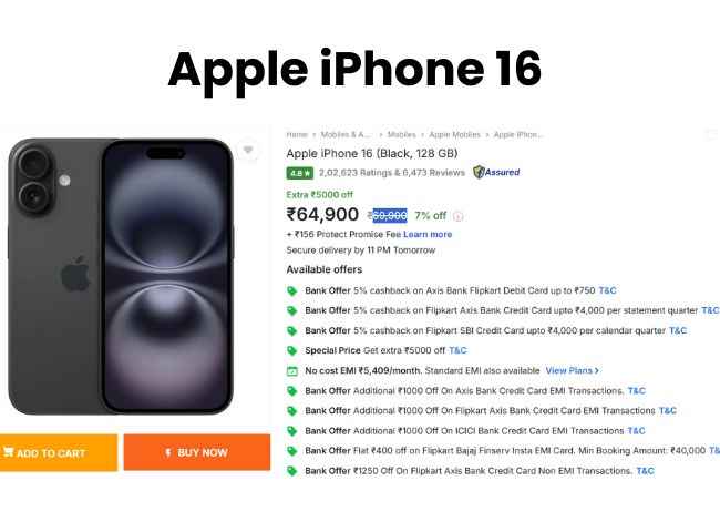Apple iPhone 16 போன் பிளிப்கார்டில் ரூ,64,900க்கு லிஸ்ட்டிங் செய்யப்பட்டுள்ளது, ஆனால் இந்த போனில் ஸ்பெஷல் டிஸ்கவுண்டின் கீழ் ரூ,5000 டிஸ்கவுண்ட் வழங்கப்படுகிறது அதன் பிறகு இந்த போனை வெறும் ரூ,59,900க்கு வாங்கலாம் அதாவது இந்த போனின் உண்மையான விலை ரூ,69,900க்கு அறிமுகம் செய்யப்பட்டது அதாவது தற்பொழுது இந்த போனில் ரூ,10,000 டிஸ்கவுண்ட் பெறலாம்.இதை தவிர இந்த போனை நோ கோஸ்ட் EMI மற்றும் பழைய போனை எக்ஸ்சேஞ் செய்து குறைந்த விலையில் வாங்கலாம்.