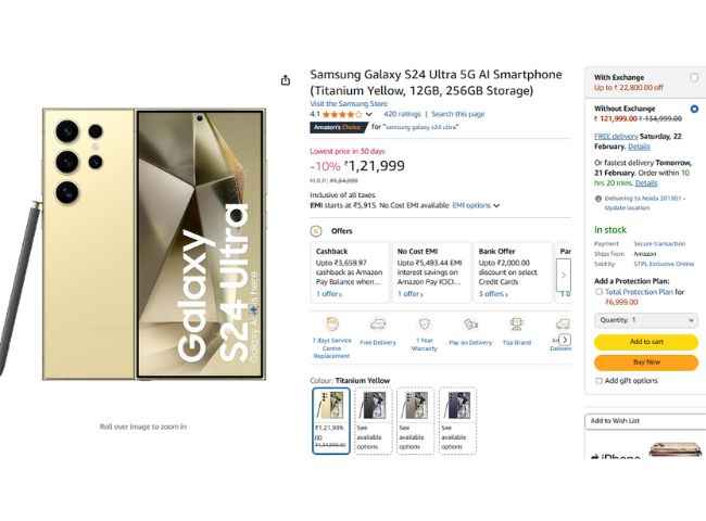 சாம்சங்கின் அதிகாரப்பூர்வ வெப்சைட்டில் , கேலக்ஸி S24 அல்ட்ரா ரூ.1,21,999க்கு லிஸ்ட் செய்யப்பட்டுள்ளது