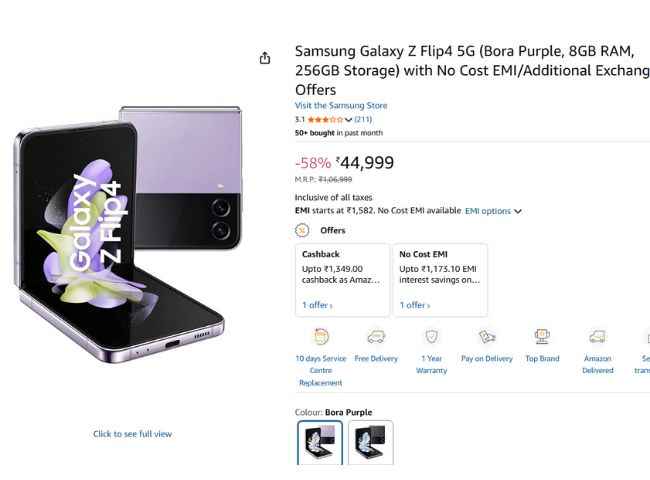 Samsung Galaxy Z Flip 4 இன் 8GB RAM மற்றும் 256GB சேமிப்பு வகை , ஆகஸ்ட் 2022 இல் அறிமுகப்படுத்தப்பட்ட ரூ,94,999 விலையில் அறிமுகம் செய்யபட்டது ஆனால் இப்பொழுது அமேசானில் ரூ,44,999 க்கு லிஸ்ட் செய்யப்பட்டுள்ளது. பேங்க் சலுகைகளில் Amazon Pay ICICI பேங்க் கிரெடிட் கார்டுடன் 5% அன்லிமிடெட் கேஷ்பேக் அடங்கும். பழைய அல்லது ஏற்கனவே உள்ள போனை எக்ஸ்சேஞ்ச் சலுகைக்காக மாற்றினால் கூடுதலாக ரூ,42,100 சேமிக்கலாம். எக்ஸ்சேஞ்ச் சலுகையின் அதிகபட்ச நன்மை, எக்ஸ்சேஞ் செய்யப்படும் போனின் தற்போதைய கண்டிஷன் மற்றும் மாடலைப் பொறுத்தது என்பது குறிப்பிடத்தக்கது. இந்த ஃபிளிப் போன் அதன் வெளியீட்டு விலையை விட சுமார் ₹50,000 குறைவாகக் கிடைக்கிறது.