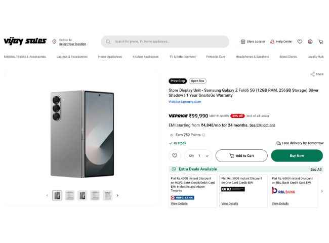 Samsung Galaxy Z Fold 6 5G இன் 12GB RAM/256GB ஸ்டோரேஜ் வகை Wise Sales யில் ரூ.99,990க்கு லிஸ்ட் செய்யப்பட்டுள்ளது . பேங்க் சலுகைகளைப் பற்றி பேசுகையில், HDFC பேங்க் டெபிட் கார்டு அல்லது கிரெடிட் கார்டு ட்ரேன்செக்சன்களுக்கு ரூ.4000 இன்ஸ்டன்ட் தள்ளுபடி கிடைக்கும், அதன் பிறகு இதன் விலை ரூ.94,990 ஆகும். இந்த ஸ்மார்ட்போன் கடந்த ஆண்டு ஜூலை மாதம் ரூ.1,64,999க்கு அறிமுகப்படுத்தப்பட்டது , அதன்படி இது ரூ.70,009 குறைந்த விலையில் வாங்கலாம் ஆனால் அதுவே மற்ற இ-காமர்ஸ் தளமான flipkart யில் ரூ,1,16,250 மற்றும் அதுவே அமேசானில் ரூ,1,22,999க்கும் லிஸ்ட்டிங் செய்யப்பட்டுள்ளது எனவே இந்த போனை இங்கு மட்டுமே மிக மிக குறைந்த விலையில் வாங்கலாம்.