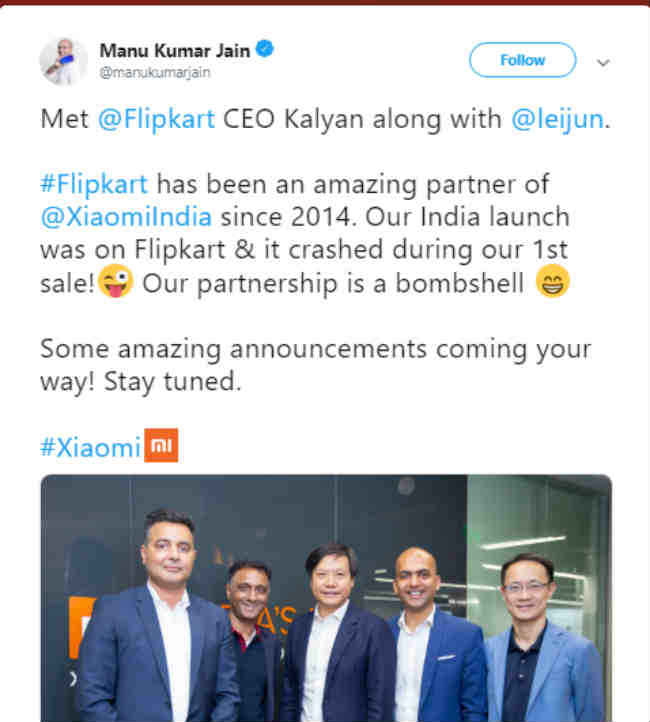 சியோமியின் மனு குமார் ஜெயின் மற்றும் தலைமை செயல் அதிகாரி லெய் ஜூன் ஆகியோர் ப்ளிப்கார்ட் தலைமை செயல் அதிகாரியை சந்தித்ததை மனு குமார் ஜெயின் தனது ட்விட்டரில் புகைப்படத்துடன் தெரிவித்திருக்கிறார். அந்த வகையில் புதிய ஸ்மார்ட்போன் பற்றிய அறிவிப்பு எதிர்பார்க்கப்படுகிறது.