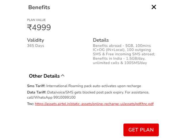 ஏர்டெல் யின் இந்த இண்டர்நேஷனல் ரோமிங் திட்டத்தை Global pack இந்தியா மற்றும் உலக நாடுபால் உடன் வரும் ரோமிங் திட்டத்மாகும் இந்த திட்டமானது ஏப்ரில் 2025 அன்று ரூ,4,000க்கு அறிமுகம் செய்யப்பட்டது மேலும் தற்பொழுது ஒரே அடியாக ரூ,999 அதிகரிக்கப்பட்டுள்ளது