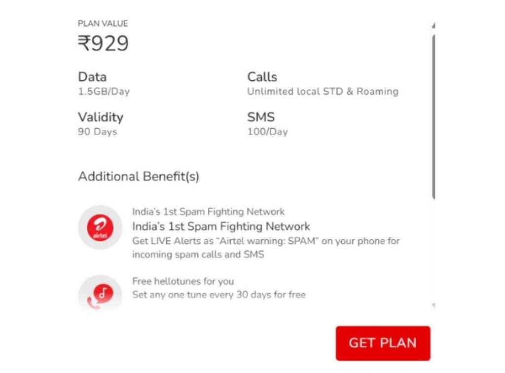 Airtel ரூ,929 திட்டத்தின் நன்மையை பற்றி பேசினால், கால்களுக்கு லிமிட் இல்லை. லோக்கல் அல்லது STD என எதுவாக இருந்தாலும், அனைத்தும் அன்லிமிடெட் ஆனது . மேலும், ரோமிங் கால்களும் இலவசம். இதன் பொருள் நீங்கள் பயணம் செய்யும் போது கூட இடையூறு இல்லாமல் பேச முடியும். இந்த பேக் ஒரு நாளைக்கு 100 SMS அனுப்ப உங்களை அனுமதிக்கிறது, கூடுதல் கட்டணம் இல்லாமல் மூன்று மாதங்களுக்கு தொடர்ச்சியான மெசேஜ்களை அனுபவிக்க உங்களை அனுமதிக்கிறது.