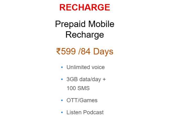 பிஎஸ்என்எல் யின் ரூ,599 யில் வரும் திட்டத்தின் நன்மையை பற்றி பேசினால், இதில் அன்லிமிடெட் வொயிஸ் காலிங், தினமும் 3GB டேட்டா மற்றும் தினமும் 100 SMS நன்மையும் வழங்குகிறது இதனுடன் இதில் OTT கேம்கள் மற்றும் பரோட்காஸ்ட் அம்சம் வழங்குகிறது இந்த திட்டத்தின் வேலிடிட்டி என வரும்போது அது 84 நாட்களுக்கு இருக்கிறது அதாவது இந்த திட்டமானது சுமார் 3 மாதங்களுக்கு இந்த திட்டம் வேலிடிட்டியாக இருக்கும்.