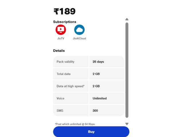 ஜியோவின் ரூ,189 இந்த திட்டம், ப்ரீபெய்ட் பிரிவில் Value பிரிவின் கீழ் லிஸ்ட் செய்யப்பட்டுள்ளது28 நாட்கள் வேலிடிட்டியுடன் வருகிறது குறைந்த செலவில் ஒரு முழு மாத வேலிடிட்டியை விரும்பும் கஸ்டமர்களை இது இலக்காகக் கொண்டுள்ளது.