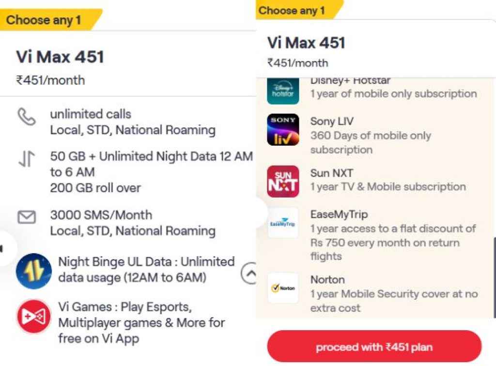 வோடபோன் ஐடியாவின் குறைந்த விலை போஸ்ட்பெய்ட் திட்டத்தின் விலை ரூ,451 யில் வருகிறது, இந்த திட்டத்தில் அன்லிமிடெட் வொயிஸ் காலிங் மாதந்திர 3000 SMS மற்றும் 50GB யின் டேட்டா உடன் அன்லிமிடெட் நைட் டேட்டா 12 AM to 6 AM வரை நன்மை பெறலாம் இதில் டேட்டா ரோல்ஓவர் லிமிட் Vi Games நன்மையும் இதில் சேர்க்கப்பட்டுள்ளது.