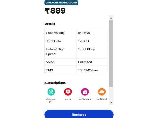 ஜியோவின் இந்த திட்டத்தை பற்றி பேசினால் இது ரூ,889 யில் வருகிறது, இதில் அன்லிமிடெட் வொயிஸ் காலிங்,தினமும் 100 SMS மற்றும் தினமும் 1.5GB டேட்டா வழங்கப்படுகிறது மேலும் இந்த திட்டத்தின் வேலிடிட்டி 84 நாட்களுக்கு வருகிறது மேலும் ரூ,889 திட்டத்தில் ioSaavn Pro, JioTV, JioCinema, மற்றும் JioCloud. நன்மை வழங்குகிறது ஆனால் இதில் அன்லிமிடெட் 5G நன்மை ஏதும் கிடைக்காது