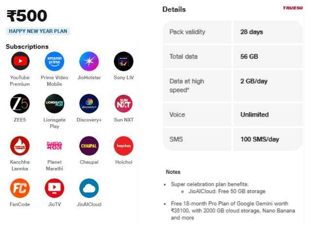 ரிலையன்ஸ் ஜியோவின் இந்த திட்டத்தின் விலை ரூ,500 ஆகும் இதில் கஸ்டமர்களுக்கு ஒரு நாளைக்கு 2 ஜிபி டேட்டாவை வழங்குகிறது, மொத்தம் 56 ஜிபி. இதில் அன்லிமிடெட் வொயிஸ் காலிங் மற்றும் ஒரு தினமும் 100 எஸ்எம்எஸ் ஆகியவற்றை வழங்குகிறது. ஜியோ 50 ஜிபி இலவச ஜியோஏஐகிளவுட் ஸ்டோரேஜ் சேர்த்துள்ளது மேலும் இந்த திட்டத்தின் வேலிடிட்டி 28 நாட்களாக இருக்கிறது.