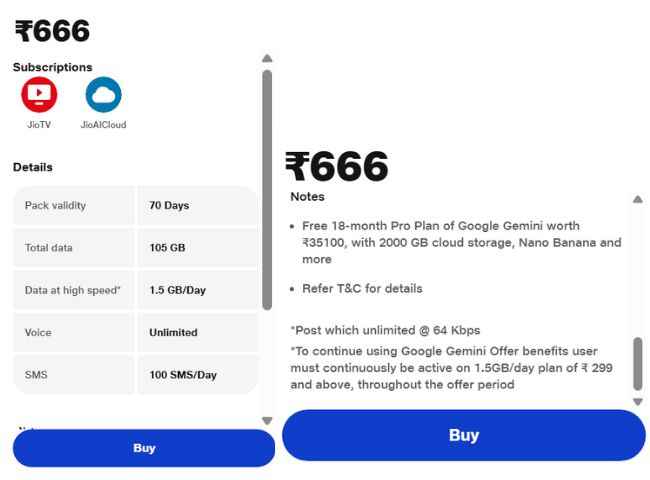 ரிலையன்ஸ் ஜியோவின் இந்த திட்டத்தின் விலை ரூ,500 ஆகும் இதில் கஸ்டமர்களுக்கு ஒரு நாளைக்கு 2 ஜிபி டேட்டாவை வழங்குகிறது, மொத்தம் 56 ஜிபி. இதில் அன்லிமிடெட் வொயிஸ் காலிங் மற்றும் ஒரு தினமும் 100 எஸ்எம்எஸ் ஆகியவற்றை வழங்குகிறது. ஜியோ 50 ஜிபி இலவச ஜியோஏஐகிளவுட் ஸ்டோரேஜ் சேர்த்துள்ளது மேலும் இந்த திட்டத்தின் வேலிடிட்டி 28 நாட்களாக இருக்கிறது. இதை தவிர இந்த திட்டத்தில் ரூ,35,100 மதிப்புள்ள google Gemini AI Pro 18 மாதங்கள் வரையிலான இலவச சப்ஸ்க்ரிப்ஷன் இதனுடன் கூடுதலாக 2000GB கூகுள் கிளவுட் ஸ்டோரேஜ் நன்மை உடன் இந்த திட்டத்தில் அன்லிமிடெட் 5G நன்மையும் வழங்கப்படுகிறது.