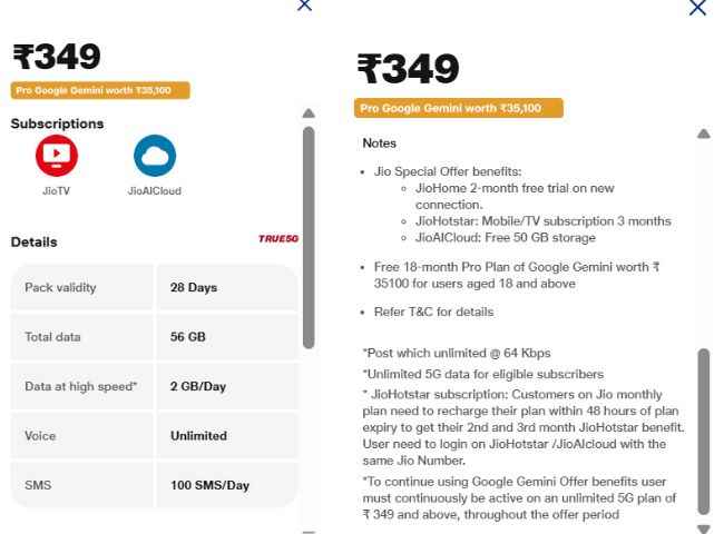 Google Gemini AI Pro நன்மையுடன் கூடவே அதன் கஸ்டமர்களுக்கு இலவச Google யின் பல் பிளாட்பாரம் எக்சஸ் போன்றவை வழங்குகிறது, இதனுடன் இதில் Google Gemini AI Pro, 2TB Google One Cloud Storage, Veo 3.1, NotebookLM, Google Workspace மற்றும் Nano Banana போன்ற பிளாட்பாரம் அடங்கியுள்ளது, இதன் மூலம் பல நன்மைகளை ஒரே இடத்தில் பெற முடியும் இதை தவிர ஜியோரூ,349 வரும் இந்த திட்டத்தில் அன்லிமிடெட் 5G நன்மை வழங்குகிறது இதை தவிர Google Gemini AI Pro நன்மை பெறலாம்.