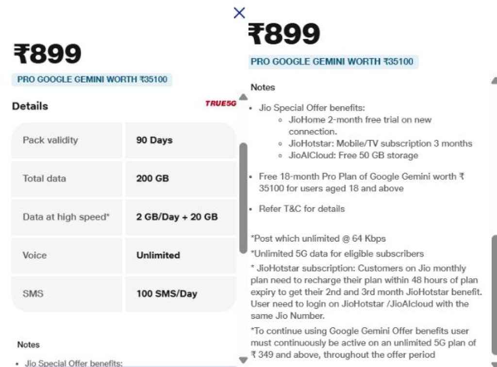 ஜியோவின் ரூ,899 இந்த கூடுதல் டேட்டாவுடன் கூடிய இரண்டாவது திட்டம் ரூ.899 திட்டம். இந்த திட்டம் 90 நாட்கள் வேலிடிட்டி தரும். இந்த திட்டம் அன்லிமிடெட் வொயிஸ் காலிங் , ஒரு நாளைக்கு 100 இலவச SMS மற்றும் 2 ஜிபி தினசரி டேட்டாவுடன் 20 ஜிபி கூடுதல் டேட்டாவையும் வழங்குகிறது. 5ஜி பயனர்கள் இந்த திட்டத்தின் மூலம் அன்லிமிடெட் 5G டேட்டாவுடன் பயனடையலாம்.