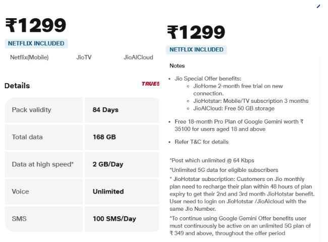 ரிலையன்ஸ் ஜியோவின் இந்த திட்டமானது ரூ,1299 யில் வருகிறது மேலும் இந்த திட்டத்தில் அன்லிமிடெட் வொயிஸ் காலிங், தினமும் 2GB டேட்டா மற்றும் தினமும் 100 SMS வழங்குகிறது இதை தவிர இந்த திட்டத்தின் சேவை வேலிடிட்டி 84 நாட்கள் இருக்கிறது இதை தவிர இதன் நன்மை இங்கே முடிந்து விடவில்லை இதனுடன் இதில் OTT (over-the-top) நன்மையாக Netflix (mobile) அதிகபட்ச நன்மை இதனுடன் கஸ்டமர்களுக்கு JioTV மற்றும் JioAICloud போன்ற நன்மை வழங்குகிறது இதனுடன் இந்த திட்டத்தில் அதிகபட்சமாக 168GB டேட்டா வழங்கப்படுகிறது.