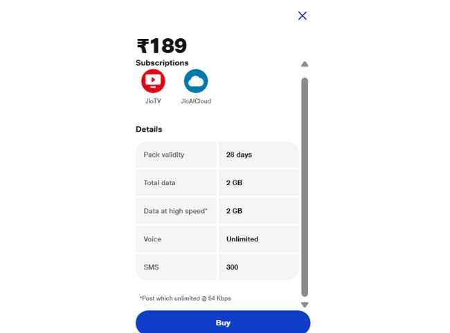 ரூ,189 திட்டம் என்பது காலிங் மற்றும் டேட்டா சேவைகளுக்கு மட்டும் அல்லாமல் . இது ஜியோ டிவி, ஜியோ சினிமா மற்றும் ஜியோ கிளவுட் போன்ற டிஜிட்டல் சேவைகளுக்கான அக்சஸ் வழங்குகிறது. இதன் மூலம் கஸ்டமர்கள் என்டர்டைன்மென்ட் மற்றும் கிளவுட் ஸ்டோரேஜ் அனுபவிக்க முடியும்.