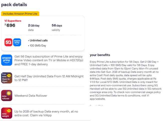 வோடபோன் ஐடியாவின் மற்றொரு திட்டம் ரூ,696 யில் வருகிறது இந்த திட்டத்தில் அன்லிமிடெட் காலிங் தினமும் 2GB டேட்டா உடன் அன்லிமிடெட் 5G டேட்டா நன்மையும் பெறலாம் இதை தவிர இந்த திட்டத்தின் வேலிடிட்டி 56 நாட்களுக்கு இருக்கும் அதாவது நீங்கள் இந்த திட்டத்தில் Amazon prime lite சப்ஸ்க்ரிப்ஷன் யனர்கள் HD (720p) யில் டிவியில் அல்லது தங்கள் போனில் பிரைம் வீடியோ கன்டென்ட் அனுபவிக்க முடியும் மேலும் இதன் நன்மை 56 நாட்களுக்கு வழங்கப்படுகிறது இதை தவிர அமேசானில் ஆர்டர் செய்யும் போர்த்களுக்கு 1 நாள் டெலிவரி வசதி வழங்கப்படுகிறது இதை தவிர இந்த திட்டத்தில் நைட் ரோல் ஓவர் நன்மை 12 AM லிருந்து 12 PM வரை அன்லிமிடெட் டேட்டா நன்மை பெற முடியும் இதை தவிர வீக் எண்டு டேட்டா ரோல்ஓவர் , இதை தவிர ஒவ்வொரு மாதமும் கூடுதல் 2GB டேட்டா பேக்கப் போன்ற நன்மை பெறலாம்.