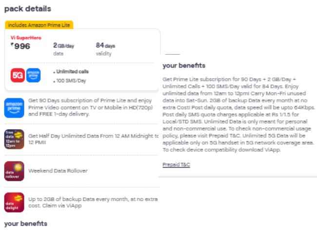 வோடபோன் ஐடியாவின் ரூ.996 ப்ரீபெய்ட் திட்டம் அன்லிமிடெட் வொயிஸ் காலிங் , ஒரு நாளைக்கு 100 SMS மற்றும் 2 ஜிபி தினசரி டேட்டாவுடன் வருகிறது. இந்த திட்டத்தின் சேவை வேலிடிட்டி காலம் 84 நாட்கள். டெலிகாம் நிறுவனத்தின் 5ஜி கவரேஜில் பயனர்கள் இருந்தால், இந்த திட்டத்துடன் அன்லிமிடெட் 5ஜி சேவையும் கிடைக்கும். இந்த திட்டத்துடன் இணைக்கப்பட்ட அமேசான் பிரைம் லைட் சப்ஸ்க்ரிப்ஷன் 90 நாட்களுக்கு வழங்கப்படுகிறது. இந்த சப்ஸ்க்ரிப்ஷனுடன் , பயனர்கள் HD (720p) யில் டிவியில் அல்லது தங்கள் போனில் பிரைம் வீடியோ கன்டென்ட் அனுபவிக்க முடியும், மேலும் நிறுவனத்திடமிருந்து ஒரு நாள் இலவச டெலிவரிகளையும் பெறலாம்.