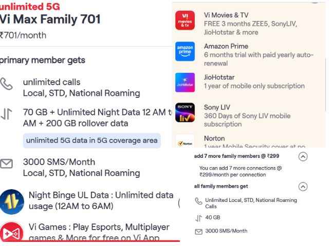வோடபோன் ஐடியாவின் இந்த திட்டம் ரூ,701 யில் வருகிறது இதில் அன்லிமிடெட் வொயிஸ் காலிங், மாதத்திற்க்கு3000 SMS மற்றும் இதில் 70GB டேட்டாவின் ப்ரைமரி கனெக்ஷன் வழங்குகிறது, மேலும் செகண்டரி கனெக்ஷன் இந்த திட்டத்துடன் இதில் 40GB டேட்டா வழங்குகிறது, இதனுடன் இந்த இந்த திட்டத்தில் கூடுதலாக 20GB யின் போனஸ் டேட்டா கஸ்டமர்களுக்கு செகண்டரி கனெக்ஷன் வழங்குகிறது நிறுவனம் இதில் அதிகபட்ச நன்மையாக Vi Games, அதன் சொந்த cloud gaming சப்ஸ்க்ரிப்ஷன் நன்மை வழங்குகிறது, Vi Games அறிமுகம் செய்தது மேலும் இது Nazara டெக்னாலஜி உடன் சில வருஷங்களுக்கு கூட்டு சேர்ந்தது.