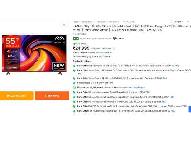 iFFALCON 55-இன்ச் அல்ட்ரா HD LED ஸ்மார்ட் டிவி, 60Hz புதுப்பிப்பு வீத ஆதரவுடன் கூடிய அல்ட்ரா HD LED டிஸ்ப்ளேவைக் கொண்டுள்ளது, இது படிக-தெளிவான படத் தரத்தை வழங்குகிறது. ஒலியைப் பொறுத்தவரை, இது இரண்டு 24W ஸ்பீக்கர்களைக் கொண்டுள்ளது. இது கூகிள் டிவியில் இயங்குகிறது, இது Netflix, JioHotstar, Prime Video, YouTube, Zee5 மற்றும் Voot ஆகியவற்றைப் பார்க்க உங்களை அனுமதிக்கிறது. இணைப்பு விருப்பங்களில் மூன்று HDMI மற்றும் ஒரு USB போர்ட், WiFi மற்றும் Bluetooth ஆகியவை அடங்கும். இது ஒரு வருட உத்தரவாதத்துடன் வருகிறது.