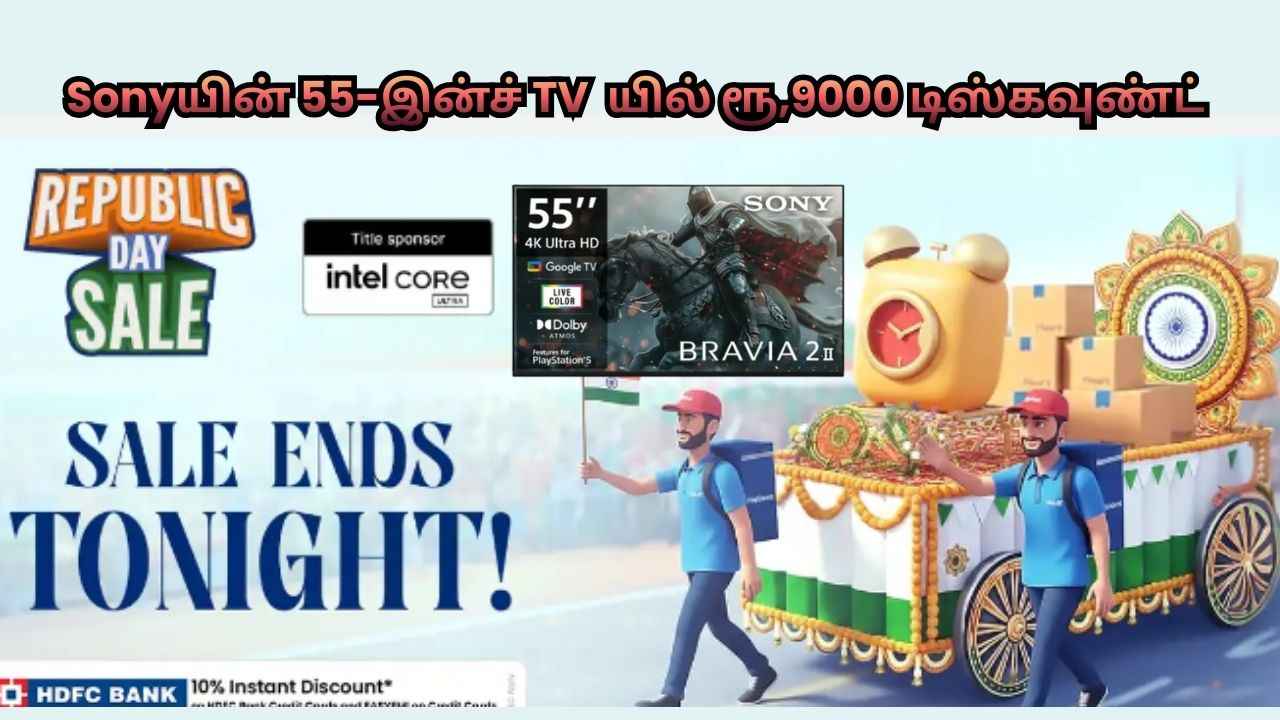 Flipkart Republic Day Sale 2026 இன்று முடிவடைகிறது நீங்கள் Sony Bravia 55-இன்ச் கொண்ட TV வாங்க நினைத்தால் குறைந்த விலையில் வாங்கலாம் மேலும் மிக சிறந்த மற்றும் பெரிய பிரெண்ட் இ-காமர்ஸ் தளமான ப்ளிப்கார்டில் குறைந்த விலையில் வாங்கலாம், மேலும் இதை விற்பனையின் மூலம் இந்த டிவியை 9000ரூபாய் வரை மிக சிறந்த டிஸ்கவுண்ட் பெறலாம்.