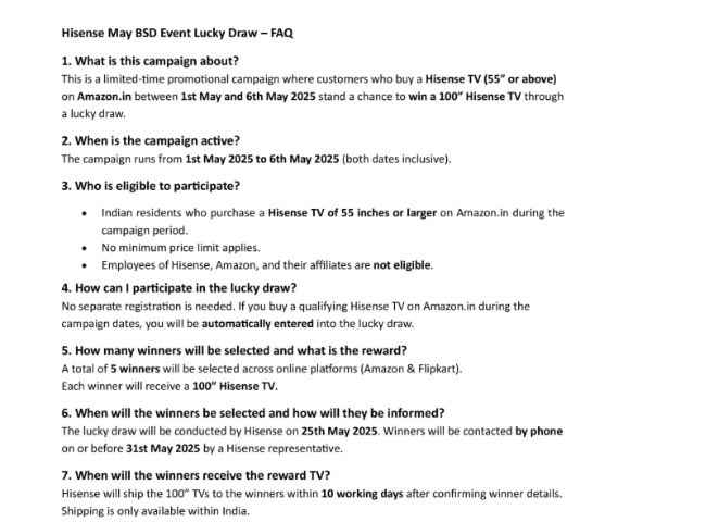 Hisence TV வாங்க தனியாக எந்த ஒரு ரெஜிஸ்ட்ரேசன் இல்லை நீங்கள் அமேசானில் இருந்து Hisence TV இந்த மே 1,2025 லிருந்து மே 6,2025 வரை 2025 க்குள் வாங்கும்போது அது ஆட்டோமேட்டிக்காக உங்களை லக்கி ட்ராவில் சேர்க்கப்படும் மேலும் இதில் குழுக்கள் முறையில் தேர்ந்டுத்து 5 கஸ்டமர்களுக்கு மட்டுமே இலவசமாக 100 இன்ச் டிவி வழங்கப்படும்
