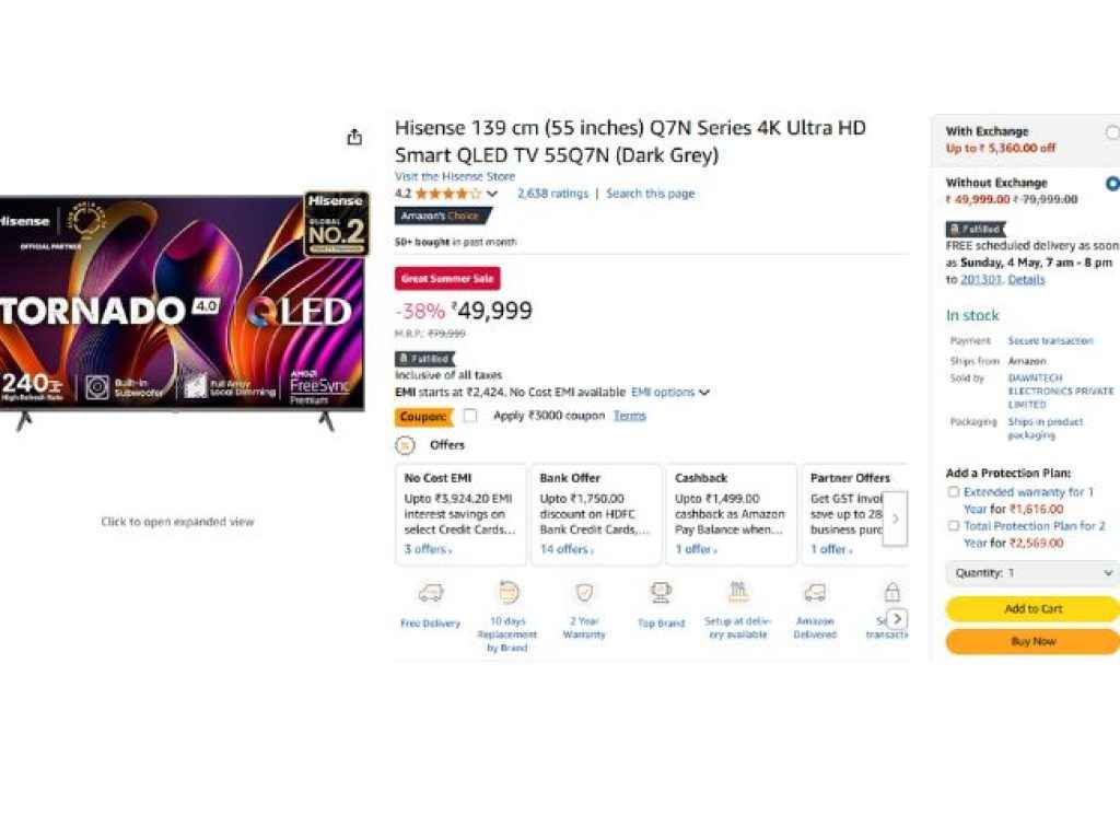 Hisense யின் இந்த டிவி அமேசானில் 49,999ரூபாய்க்கு லிஸ்ட்டிங் செய்யப்பட்டுள்ளது, ஆனால் இதில் கூப்பன் ஆபரக ரூ,3000 டிஸ்கவுண்ட் மற்றும் ரூ,1750 பேங்க் ஆபர் இன்ஸ்டன்ட் டிஸ்கவுண்ட் வழங்கப்படுகிறது அதன் பிறகு இதை வெறும் ரூ,45,249க்கு வாங்கலாம் மேலும் இதை நோ No Cost EMI போன்ற பல ஆபர் நன்மையும் வழங்கப்படுகிறது மேலும் இந்த டிவியின் அம்சம் பற்றி பேசினால் இது 55 இன்ச் QLED கொண்ட 4K ரெசளுசனுடன் இது 120 Hz ரெப்ராஸ் ரேட் டிஸ்ப்ளே வழங்குகிறது மேலும் பல ஆபருடன் இங்கிருந்து வாங்கவும்.