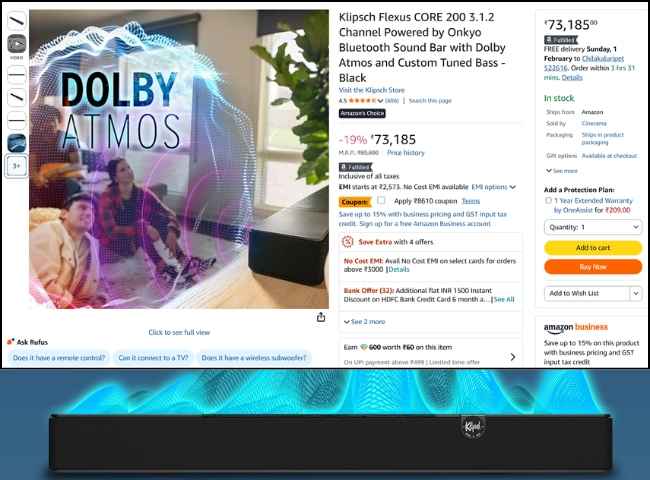 Klipsch 3.1.2 Dolby Atmos సౌండ్ బార్ పై అమెజాన్ ఇండియా ఈరోజు ఏకంగా రూ. 10,000 భారీ డిస్కౌంట్ ఆఫర్ అనౌన్స్ చేసింది. ఇది ప్రముఖ అమెరికన్ బ్రాండ్ క్లిప్స్ చ్ నుంచి వచ్చిన సూపర్ సౌండ్ బార్ మరియు ఇది టాప్ నోచ్ సౌండ్ ఆఫర్ చేస్తుంది. అమెజాన్ అందించిన ఈ గ్రేట్ డీల్ పై ఒక లుక్కేయండి.