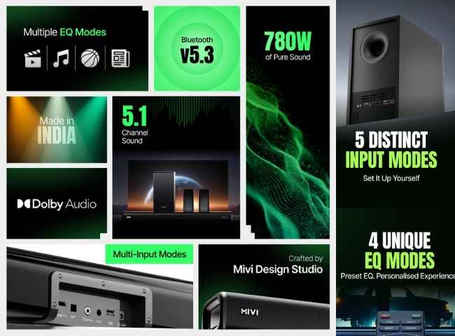 ఈ మివి సౌండ్ బార్ 5.1 ఛానల్ సెటప్ తో వస్తుంది మరియు ఈ సౌండ్ బార్ చాలా ప్రీమియం డిజైన్ కలిగి ఉంటుంది. ఈ సౌండ్ బార్ మూడు స్పీకర్లు కలిగిన బార్, రెండు రియర్ శాటిలైట్ స్పీకర్లు మరియు సబ్ ఉఫర్ కలిగిన 5.1 ఛానల్ సెటప్ తో ఉంటుంది. ఈ సౌండ్ బార్ 8 ఇంచ్ పవర్ ఫుల్ సబ్ ఉఫర్ తో వస్తుంది మరియు ఇది ఇంటిని సైతం షేక్ చేసే జబర్దస్త్ బాస్ సౌండ్ అందిస్తుంది. ఈ సౌండ్ బార్ టోటల్ 780W సౌండ్ అందిస్తుంది మరియు నాలుగు ప్రీ సెట్ ఈక్వలైజర్ మోడ్ తో కూడా వస్తుంది.