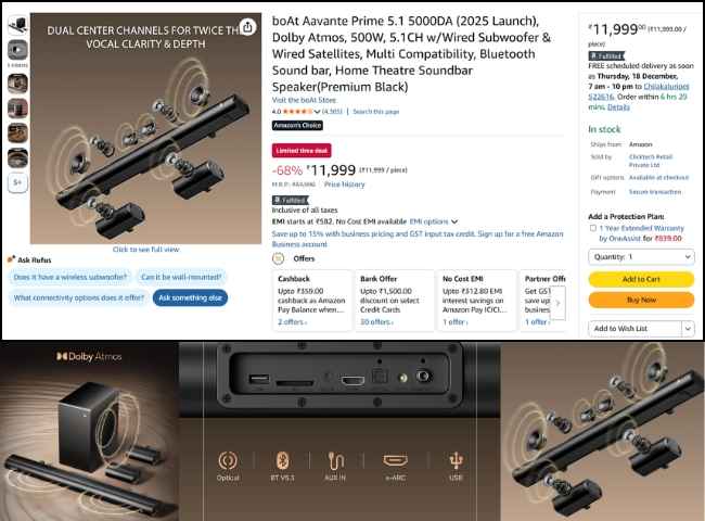అమెజాన్ మెగా ఎలక్ట్రానిక్స్ డేస్ సేల్ నుంచి ఈరోజు బోట్ Aavante Prime 5.1 5000DA సౌండ్ బార్ పై ఈ డీల్ అందించింది. ఈ సౌండ్ బార్ రూ. 14,999 రూపాయల ధరతో లాంచ్ అయ్యింది మరియు మూడు రోజుల క్రితం కూడా రూ. 12,999 ప్రైస్ స్టాంప్ తో సేల్ అయ్యింది. అయితే, ఈరోజు అమెజాన్ కొత్త సేల్ నుంచి అందించిన మరింత డిస్కౌంట్ తో కేవలం రూ. 11,999 రూపాయల ధరతో సేల్ అవుతోంది.