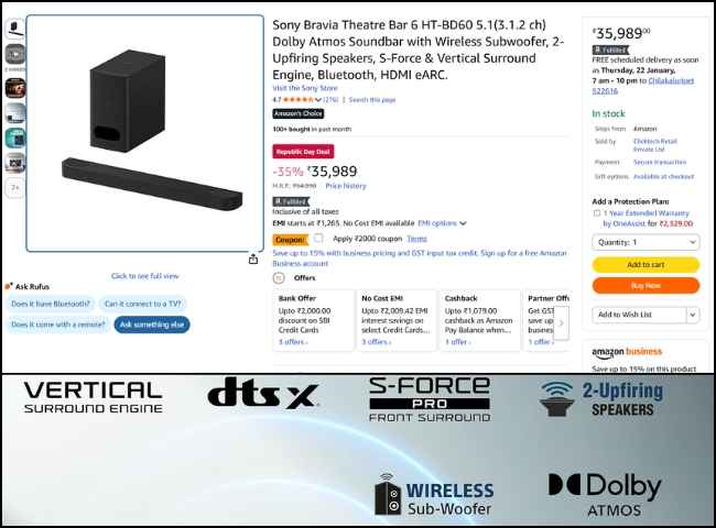 అమెజాన్ గ్రేట్ రిపబ్లిక్ డే సేల్ 2026 నుంచి ఈరోజు సోనీ డాల్బీ అట్మాస్ సౌండ్ బార్ Bravia Theatre Bar 6 HT-BD60 పై ఈ ఈ బేస్డ్ డీల్స్ అందించింది. ఈ సౌండ్ బార్ ఈరోజు అమెజాన్ నుంచి రూ. 35,989 ప్రైస్ ట్యాగ్ తో లిస్ట్ అయ్యింది. ఈ సౌండ్ బార్ పై రూ. 2,000 రూపాయల భారీ కూపన్ డిస్కౌంట్ ఆఫర్ ను అమెజాన్ సేల్ నుంచి ముందుగా అందించింది. ఈ ఆఫర్ తో ఈ సౌండ్ బార్ కేవలం రూ. 33,989 రూపాయల ఆఫర్ ధరలో లభిస్తుంది.