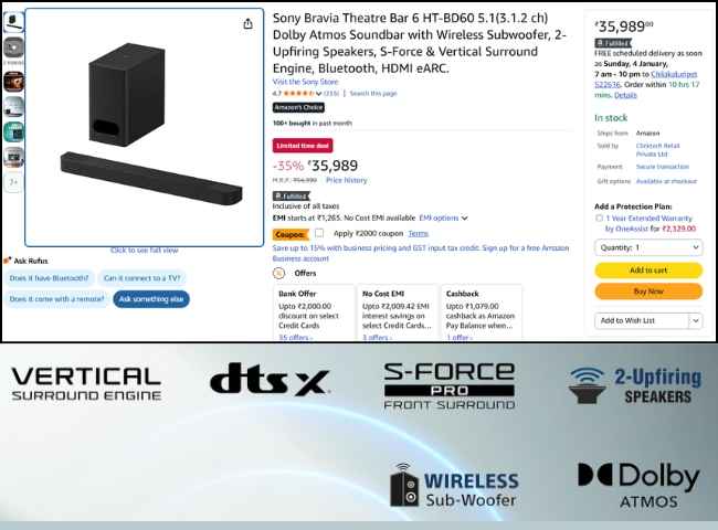 న్యూ ఇయర్ వేడుకల్లో భాగంగా అమెజాన్ ఇండియా ఈ రోజు బిగ్ డిస్కౌంట్ ఆఫర్ ని అందించింది. సోనీ ఇండియాలో విడుదల చేసిన లేటెస్ట్ సోనీ సౌండ్ బార్ Bravia Theatre Bar 6 HT-BD60 5.1 పై ఈ డీల్స్ అందించింది. ఈ సౌండ్ బార్ పై మొత్తం మూడు డీల్స్ అందించింది మరియు మూడు డీల్స్ దెబ్బకు ఈ సౌండ్ బార్ కేవలం మంచి ఆఫర్ ధరలో లభిస్తుంది.