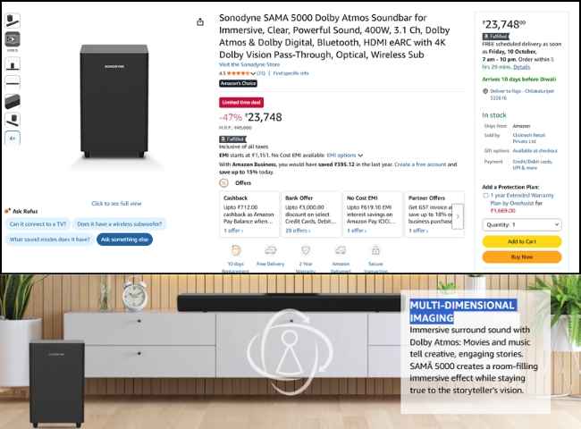 పైన తెలిపిన రెండు అఫ్సర్ తో ఈ సౌండ్ బార్ కేవలం రూ. 22,248 రూపాయల అతి తక్కువ ధరలో లభిస్తుంది. ఈ సౌండ్ బార్ ని అమెజాన్ సేల్ నుంచి ఆఫర్ ధరతో కొనుగోలు చేయాలనుకునే వారు Buy From Here లింక్ పై క్లిక్ చేసి ఆఫర్ ధరకు కొనుగోలు చేయవచ్చు.