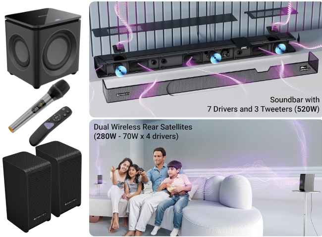 జెబ్రోనిక్స్ ఈ సౌండ్ బార్ ను ప్రీమియం ఫీచర్స్ మరియు సెటప్ తో అందించింది. ఇది 7.2.4 ఛానల్ సెటప్ కలిగిన సౌండ్ బార్ మరియు టోటల్ 1100W RMS పవర్ ఫుల్ గ్రౌండ్ షేకింగ్ సౌండ్ అందిస్తుంది. ఈ సౌండ్ బార్ కంప్లీట్ సెటప్ తో వస్తుంది. ఈ సౌండ్ బార్ సెటప్ లో మొత్తం మూడు విభాగాలు ఉంటాయి. అందులో, 7 ఫుల్ రేంజ్ స్పీకర్లు మరియు 3 ట్వీటర్లు ఉంటాయి మరియు ఇది టోటల్ 520W సౌండ్ అందించే బార్. తర్వాత, ఒక్కొక్క బాక్స్ లో రెండు స్పీకర్లు కలిగిన రెండు శాటిలైట్ స్పీకర్లు మరియు రెండు ఉఫర్స్ మరియు రెండు రేడియేటర్స్ కలిగిన పవర్ ఫుల్ సబ్ ఉఫర్ కలిగి ఉంటుంది.