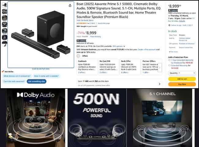 ఈ బోట్ 5.1 డాల్బీ ఆడియో సౌండ్ బార్ అమెజాన్ యూజర్ల నుంచి 4 స్టార్ రేటింగ్ అందుకుంది మరియు మంచి రివ్యూలు కూడా అందుకుంది. ఈ సౌండ్ బార్ ఈరోజు అమెజాన్ సేల్ నుంచి బెస్ట్ ప్రైస్ తో లభిస్తుంది.