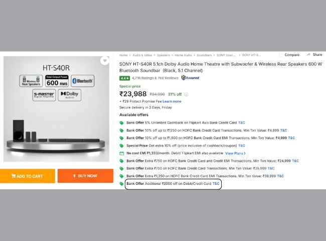 కేవలం పైన తెలిపిన డిస్కౌంట్ మాత్రమే కాదు ఈ సౌండ్ బార్ పై మరో గొప్ప ఆఫర్ కూడా అందించింది. అదేమిటంటే, ఈ సోనీ సౌండ్ బార్ ను డెబిట్ లేదా క్రెడిట్ కార్డ్ ఆప్షన్ తో కొనుగోలు చేస్తే రూ. 2,000 రూపాయల అదనపు డిస్కౌంట్ లభిస్తుంది. ఈ ఆఫర్ ఈ సౌండ్ బార్ ను కేవలం రూ. 21,988 ధరకే అందుకోవచ్చు.