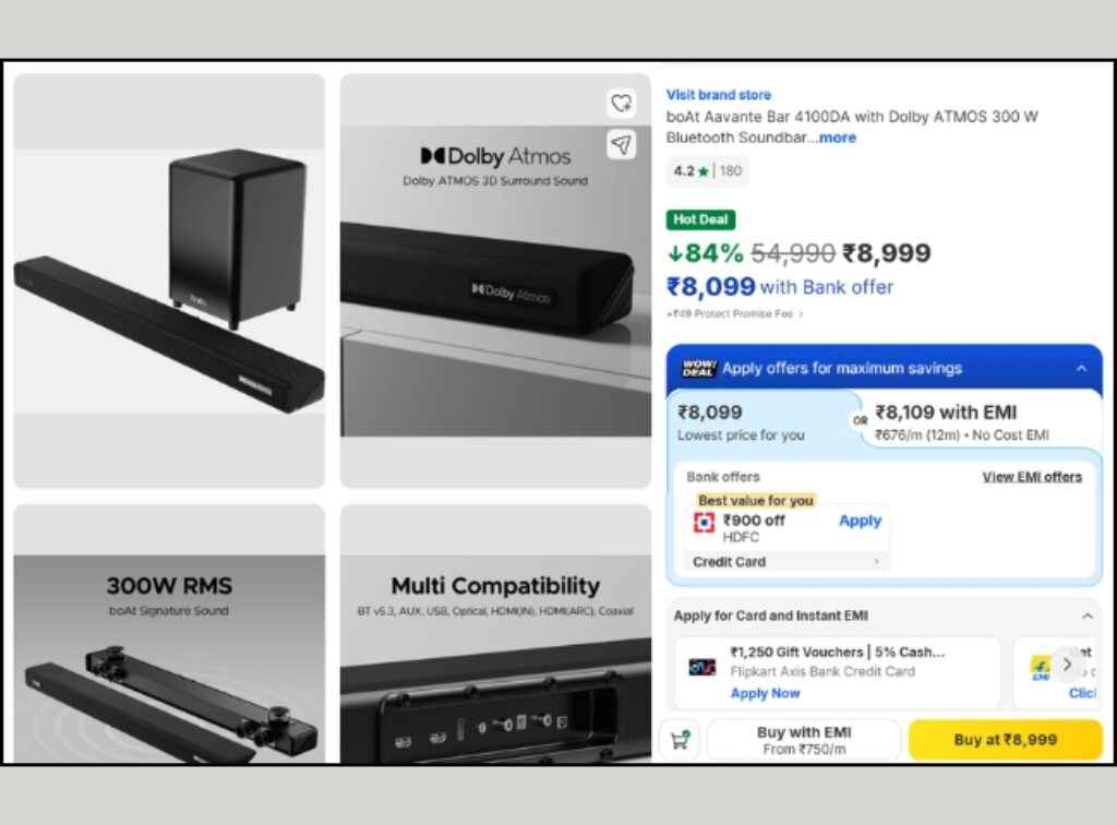 బోట్ యొక్క 3.1.2 డాల్బీ అట్మోస్ సౌండ్ బార్ Aavante Bar 4100DA ఈరోజు 8 వేల రూపాయల ధరలో లభిస్తోంది. ఈ బిగ్ డిస్కౌంట్ ఆఫర్ ను ఫ్లిప్ కార్ట్ అందించింది. ఫ్లిప్ కార్ట్ ఈ బోట్ సౌండ్ బార్ ను 84% భారీ డిస్కౌంట్ తో కేవలం రూ. 8,999 ధరకు సేల్ చేస్తోంది. ఇది కాకుండా ఈ సౌండ్ బార్ పై HDFC బ్యాంక్ క్రెడిట్ కార్డ్ ఆప్షన్ పై రూ. 900 అదనపు బ్యాంక్ డిస్కౌంట్ కూడా అందించింది. ఈ ఆఫర్ తో ఈ సౌండ్ బార్ కేవలం రూ. 8,099 రూపాయల అతి చవక ధరలో మీకు లభిస్తుంది.