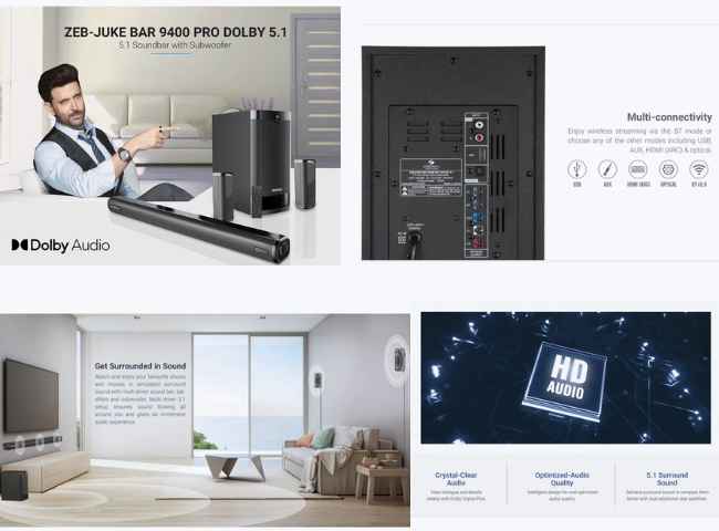 ఈ జెబ్రోనిక్స్ సౌండ్ బార్ 5.1 ఛానల్ సెటప్ తో వస్తుంది. ఇందులో మూడు స్పీకర్లు కలిగిన బార్, రెండు రియర్ శాటిలైట్ స్పీకర్లు మరియు పవర్ ఫుల్ సౌండ్ అందించే సబ్ ఉఫర్ ఉన్నాయి. ఈ సౌండ్ బార్ 525W తో జబర్దస్త్ సౌండ్ అందిస్తుంది.