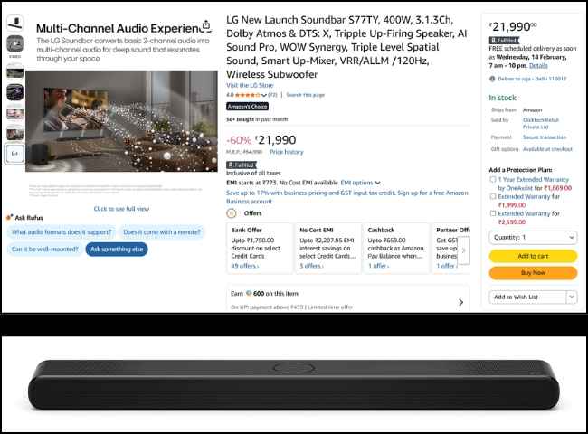 ఈ రోజు ఈ సౌండ్ బార్ కేవలం రూ. 21,990 ఆఫర్ ధరలో అమెజాన్ నుంచి లిస్ట్ అయ్యింది. ఇది కాకుండా BOB CARD EMI, IDFC FIRST, HSBC, కోటక్ మరియు Yes బ్యాంక్ క్రెడిట్ పై రూ. 1,500 రూపాయల అదనపు డిస్కౌంట్ ఆఫర్ కూడా అందించింది. ఈ ఆఫర్ తో ఈ సౌండ్ ఈరోజు అమెజాన్ నుంచి కేవలం రూ. 20,490 రూపాయల అతి తక్కువ ధరలో లభిస్తుంది. ఈ ప్రైస్ లో ఈ సౌండ్ బార్ రేటుకు మించిన గొప్ప ఫీచర్స్ కలిగి ఉంటుంది. Buy From Here