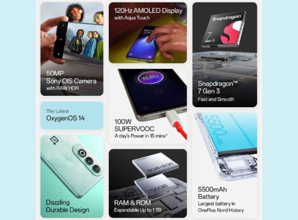 ఈ వన్ ప్లస్ స్మార్ట్ ఫోన్ క్వాల్కమ్ Snapdragon 7 Gen 3 చిప్ సెట్ తో పని చేస్తుంది. ఈ ఫోన్ 8GB ఫిజికల్ ర్యామ్, 8GB వర్చువల్ ర్యామ్ మరియు 128GB ఇంటర్నల్ స్టోరేజ్ కలిగి ఉంటుంది. ఈ ఫోన్ ఆక్వా టచ్ సపోర్ట్ మరియు ఇన్ స్క్రీన్ ఫింగర్ ప్రింట్ సెన్సార్ కలిగిన AMOLED స్క్రీన్ కలిగి ఉంటుంది. ఇది HDR 10+ సపోర్ట్ మరియు 120Hz రిఫ్రెష్ రేట్ కలిగి ఉంటుంది.