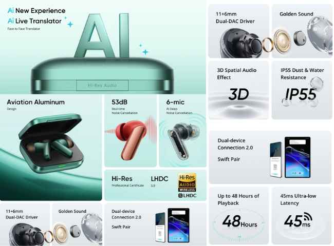 రియల్ మీ బడ్స్ ఎయిర్ 7 ప్రో ఇయర్ బడ్స్ సరికొత్త Ai ఎక్స్ పీరియన్స్ అందిస్తుంది. ఎందుకంటే, ఈ బడ్స్ Ai ట్రాన్స్ లేషన్ ఫీచర్ కలిగి రియల్ టైం లో మాటలు తర్జుమా చేస్తుంది. ఇది యూజర్ ఇంటరాక్షన్ కు చక్కగా సహాయం చేస్తుంది. ఈ బడ్స్ సరికొత్త ఏవియేషన్ అల్యూమినియం డిజైన్ కలిగి ఉంటుంది. ఈ బడ్స్ లో 11mm ఉఫర్ మరియు 6mm ట్వీటర్లు కలిపి డ్యూయల్ DAC డ్రైవర్ తో వస్తుంది. ఇది LHDC 5.0 మరియు హై రిజల్యూషన్ ఆడియో వైర్లెస్ సపోర్ట్ తో గొప్ప సౌండ్ అందిస్తుంది.