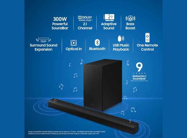 ఈ శామ్సంగ్ సౌండ్ బార్ మూడు స్పీకర్లు కలిగిన బార్ మరియు పవర్ ఫుల్ BASS సౌండ్ అందించే వైర్లెస్ సబ్ ఉఫర్ తో వస్తుంది. ఈ సౌండ్ బార్ టోటల్ 300W సౌండ్ అవుట్ తో వస్తుంది మరియు పెద్ద సైజు హాల్ ను సైతం షేక్ చేస్తుంది. అంతేకాదు, ఈ సౌండ్ బార్ ప్రీమియం లుక్ తో కూడా ఆకట్టుకుంటుంది.