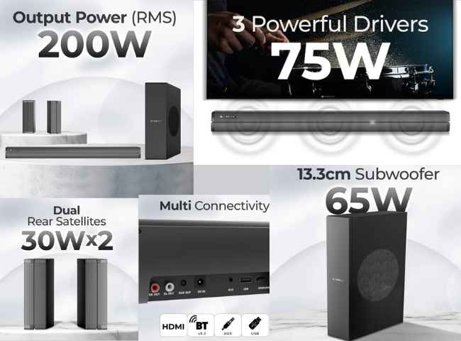 ఈ సౌండ్ బార్ 5.1 ఛానల్ సెటప్ తో వస్తుంది. ఇందులో 75W సౌండ్ అవుట్ పుట్ అందించే మూడు స్పీకర్లు కలిగిన బార్, ఒక్కొక్కటి 30W సౌండ్ అందించే రెండు రియర్ శాటిలైట్ స్పీకర్లు మరియు మంచి BASS సౌండ్ అందించే సబ్ ఉఫర్ ఉంటాయి.
