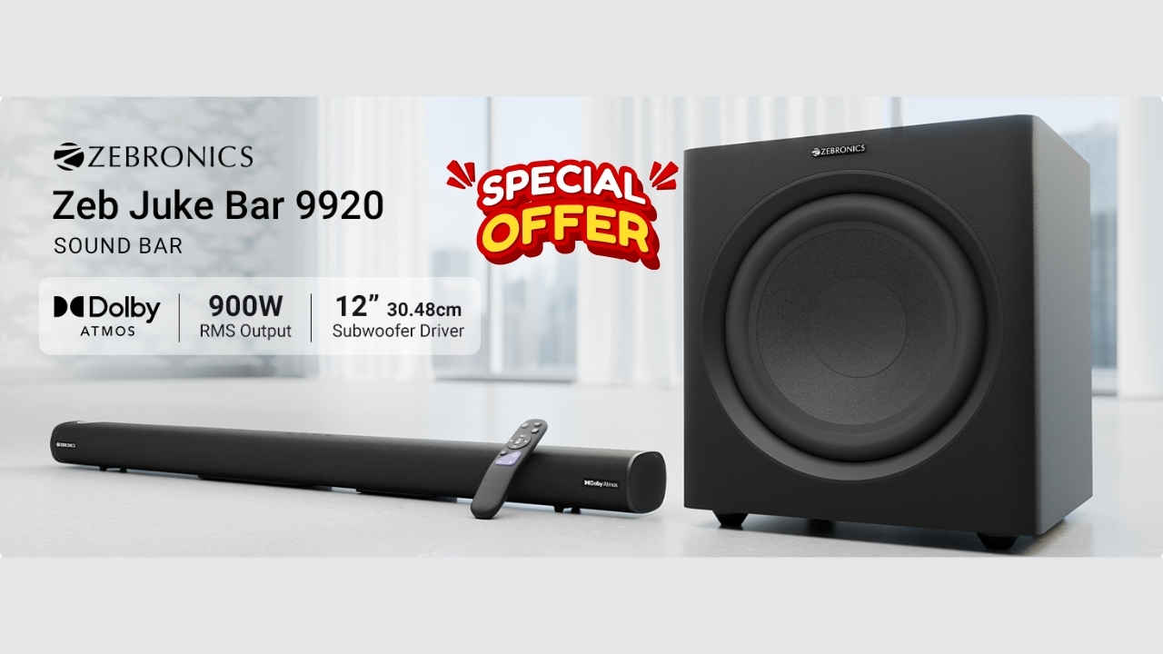 ఈ సౌండ్ బార్ కలిగిన టోటల్ సెటప్ తో 900W అవుట్ పుట్ సౌండ్ అందిస్తుంది. ఇది పెద్ద సైజు హల్ ను సైతం సౌండ్ తో షేక్ చేసే సౌండ్ బార్. అదనంగా, ఈ సౌండ్ బార్ డాల్బీ అట్మాస్ తో పాటు జెబ్రోనిక్స్ యొక్క ప్రత్యేకమైన ZEB Acoustics Max మల్టీ డైమెన్షనల్ సౌండ్ ఫీచర్ తో కూడా వస్తుంది. ఈ అన్ని ఫీచర్స్ తో ఇది మీ ఇంటిని సినిమా థియేటర్ గా మార్చేస్తుంది. ఇది HDMI (ARC), ఆప్టికల్ ఇన్, USB , AUX, మరియు బ్లూటూత్ వంటి మల్టీ కనెక్టివిటీ సపోర్ట్ కలిగి ఉంటుంది.