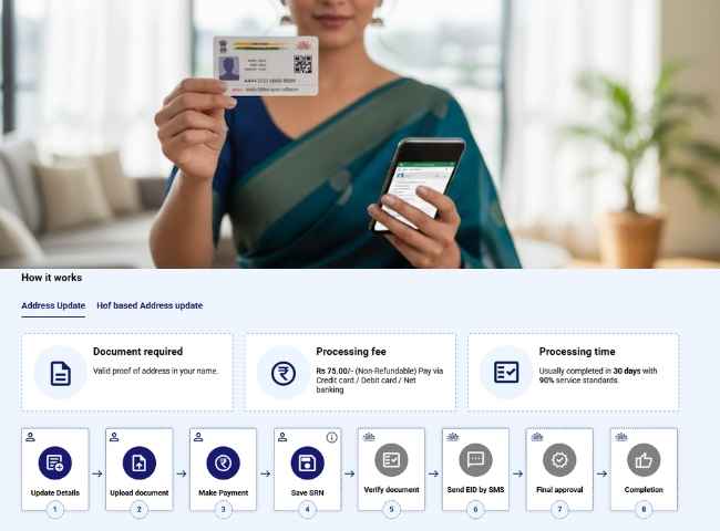 ఇదే విధంగా ఆన్లైన్ల్ లో మై ఆధార్ పోర్టల్ ద్వారా కూడా అప్డేట్ చేసుకోవచ్చు. దీనికోసం myaadhaar.uidai.gov.in పోర్టుల ఓపెన్ చేసి “Update Aadhaar Online” క్లిక్ చేయండి. మీ మొబైల్ నెంబర్ ద్వారా OTP తో లాగిన్ అవ్వండి. అడిగిన వద్ద మీ వివరాలు అందించి, పేమెంట్ చెల్లించండి. మొట్ట వివరాలు సరి చూసుకోండి మరియు సబ్మిట్ చేయండి.