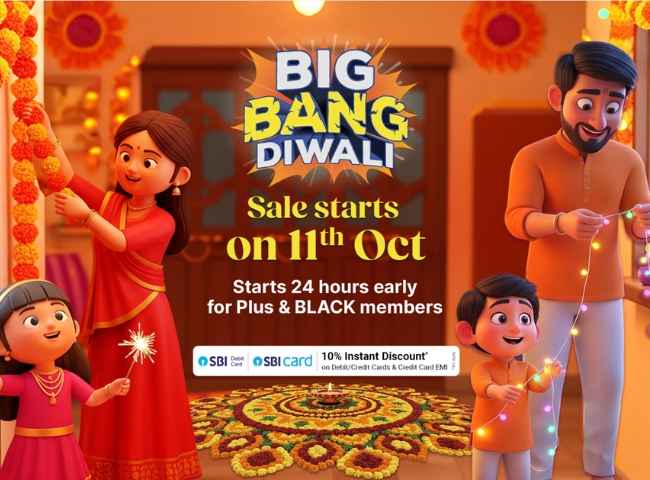 ఫ్లిప్ కార్ట్ బిగ్ బ్యాంగ్ దివాళి సేల్ 11 అక్టోబర్ 2025 నుంచి ప్రారంభం అవుతుంది. అయితే, ఫ్లిప్ కార్ట్ ప్లస్ మరియు ఫ్లిప్ కార్ట్ బ్లాక్ మెంబర్స్ కోసం ఈ సేల్ యాక్సెస్ 24 గంటల ముందుగా స్టార్ట్ అవుతుంది. ఈ సేల్ కోసం ఈసారి SBI బ్యాంక్ ని సేల్ పార్ట్నర్ గా అనౌన్స్ చేసింది. అందుకే, ఈ సేల్ నుండి SBI బ్యాంక్ క్రెడిట్ మరియు డెబిట్ కార్డు తో వస్తువులు కొనుగోలు చేసే యూజర్లకు 10% అదనపు డిస్కౌంట్ లభిస్తుంది.
