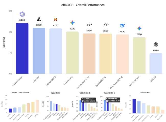 భారతీయ యువత తీసుకొచ్చిన సర్వం ఏఐ కొన్ని విషయాల్లో చాట్ జిపిటి మరియు జెమినీ కంటే మెరుగ్గా ఉంటుందని కొన్ని రిపోర్టులు చెబుతున్నాయి. అందులో అతి ముఖ్యమైనది OCR (డాక్యుమెంట్ రీడింగ్ / డాక్యుమెంట్ ఇంటెలిజెన్స్) విభాగం. ఈ విభాగంలో olmOCR-Bench లో అందించిన రిపోర్ట్ మరియు రిజల్ట్స్ సర్వం ఏఐ ని అగ్ర స్థానంలో నిలబెట్టాయి. ఈ బెంచ్ లో సర్వం ఏఐ 84.3 % కచ్చితత్వంతో చాట్ జిపిటి మరియు జెమినీ రెండింటిని వెనక్కు నెట్టి అగ్రస్థానంలో నిలిచింది.