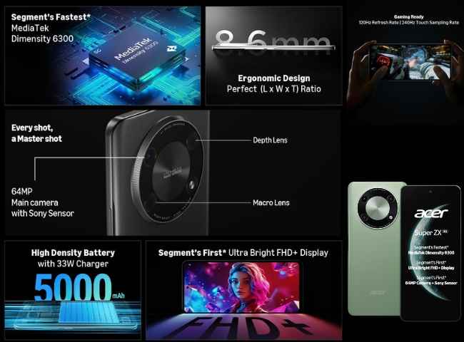 ఏసర్ సూపర్ Zx 5జి స్మార్ట్ ఫోన్ మీడియాటెక్ Dimensity 6300 5G చిప్ సెట్ తో నడుస్తుంది మరియు ఇందులో 4 జీబీ / 6 జీబీ / 8జీబీ ర్యామ్ సపోర్ట్ మరియు 128 జీబీ అంతర్గత మెమరీ ఉంటుంది. ఈ ఫోన్ 8.6mm మందం మరియు వెనుక పెద్ద రౌండ్ కెమెరా బంప్ తో ఉంటుంది. ఈ ఫోన్ 6.78 ఇంచ్ LCD డిస్ప్లే కలిగి ఉంటుంది. ఈ డిస్ప్లే 120Hz రిఫ్రెష్ రేట్ మరియు FHD+ రిజల్యూషన్ కలిగి ఉంటుంది.